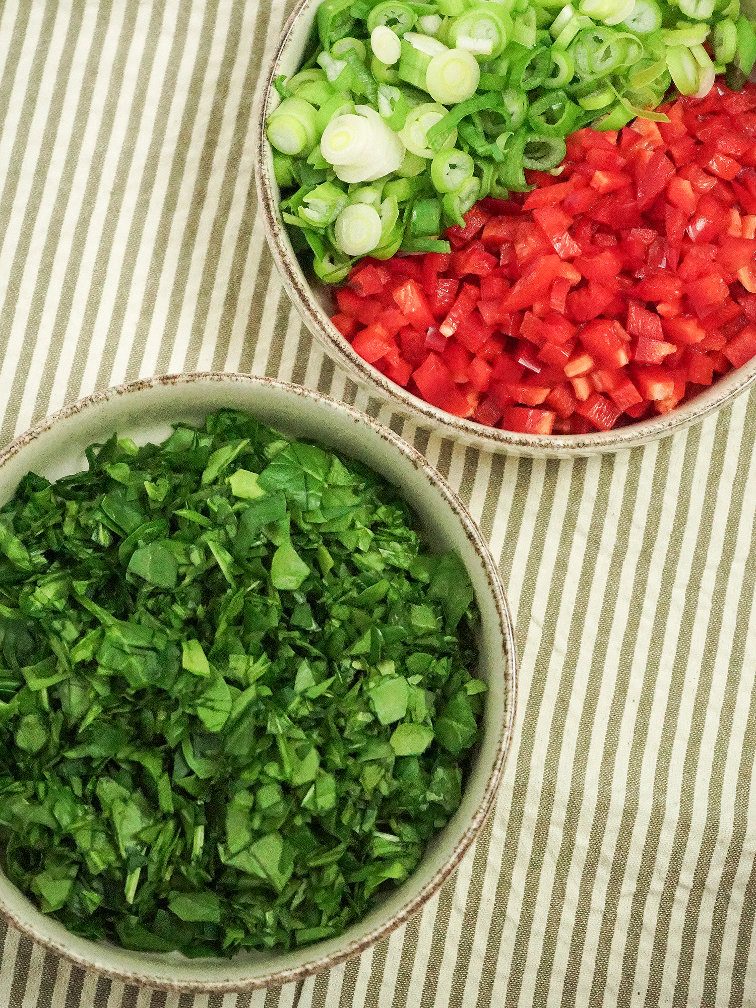 - Papriku očistíme a nakrájíme nadrobno, jarní cibulku nakrájíme na kolečka a špenát nasekáme nahrubo.